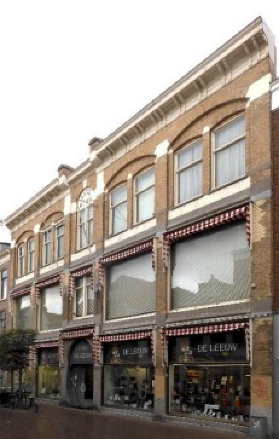 Een nog oorspronkelijk winkelhuis met etalages op de begane grond, maar ook op de eerste verdieping. Boven het glas in lood op de eerste etage is de op glas geschilderde aanduiding MANUFACTUREN zichtbaar.