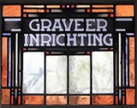Fraai hersteld glas in loodraam met onderschrift in de gevel van de Bakenesserkerk.