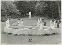 Boven de zij-entree aan de kant van de vijver is een latei met beeldhouwwerk van onder andere twee salamanders opgenomen.